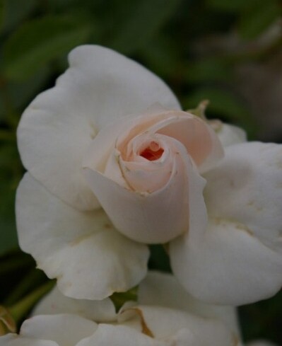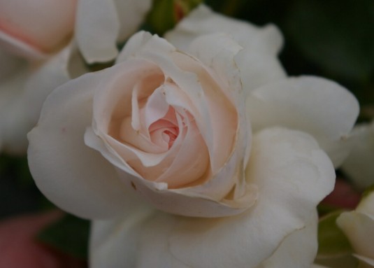 Blüte: gefüllt, weiß, edel geformt, bei kühler Witterung leicht rosa angehaucht, kann standortbedingt einen sehr zarten Duft entwickeln, selbstreinigend
